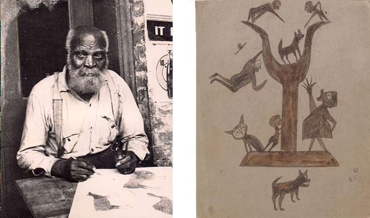 During the Great Depression, Bill Traylor was homeless, spending his days sitting on the sidewalk of Monroe Street in downtown Montgomery, Alabama, close to the state capitol. At night, he slept in the back room of the Ross-Clayton Funeral Home. One day in 1938, Bill Traylor picked up a pencil, salvaged a piece of cardboard, and began to draw. He was 85.