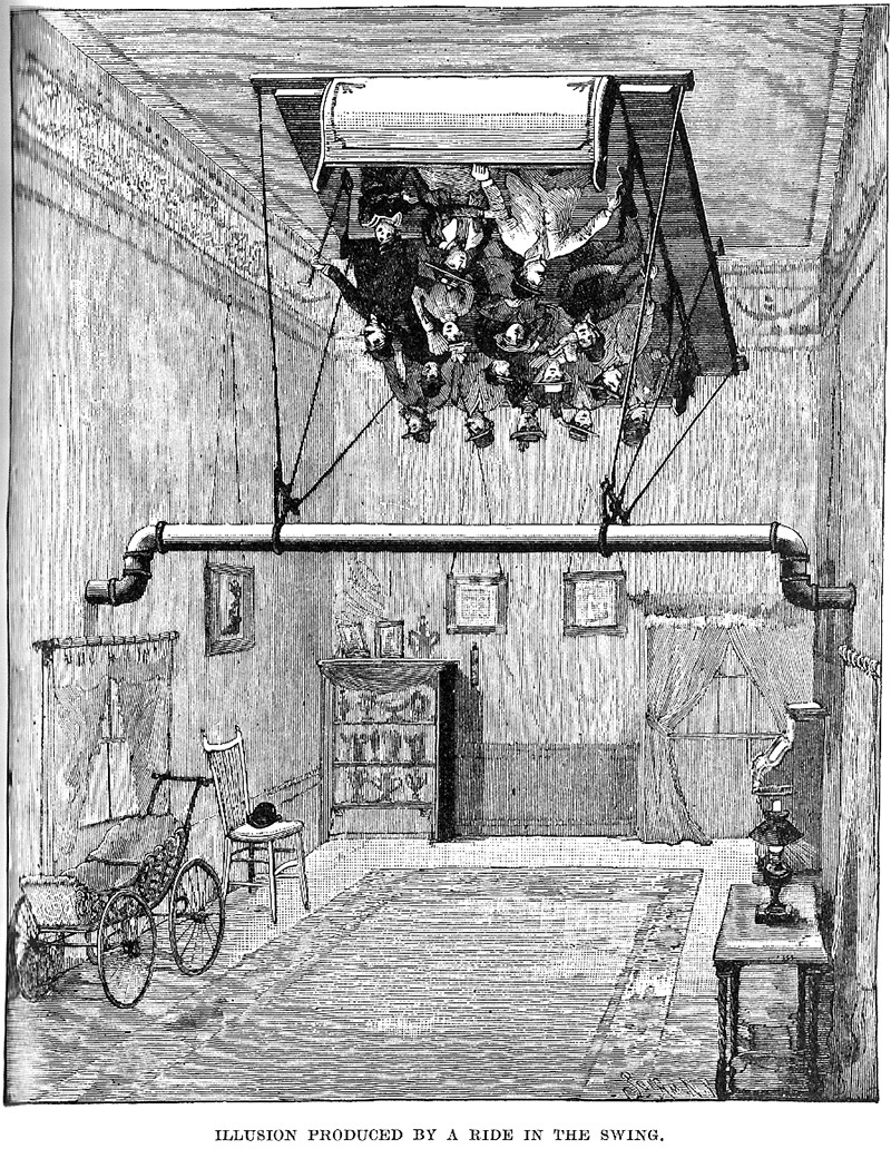 The Bug House—bug house was slang for an insane asylum in the early 20th century—is also known as the Mad House or the haunted swing illusion patented by Amariah Lake in 1893.